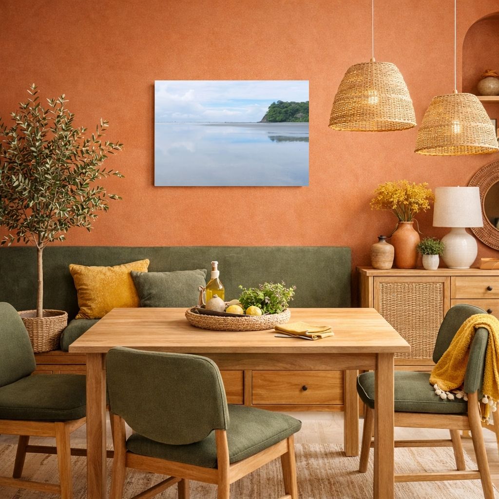 Privilégie des teintes neutres et lumineuses pour valoriser la toile imprimée aux tons bleus et blancs, représentant une plage et des nuages. Quelles couleurs de mur iront le mieux, concrètement ? Un mur blanc, écru ou sable donnera un fond apaisant qui prolonge l’effet bord de mer. Les murs bleu clair, bleu gris ou vert sauge offriront une harmonie douce sans dominer la toile imprimée paysage. Pour le mobilier, choisis le bois clair, le rotin ou les matières naturelles qui renforcent l’ambiance détente, ainsi que des touches de bleu marine ou beige pour rappeler les couleurs du paysage.